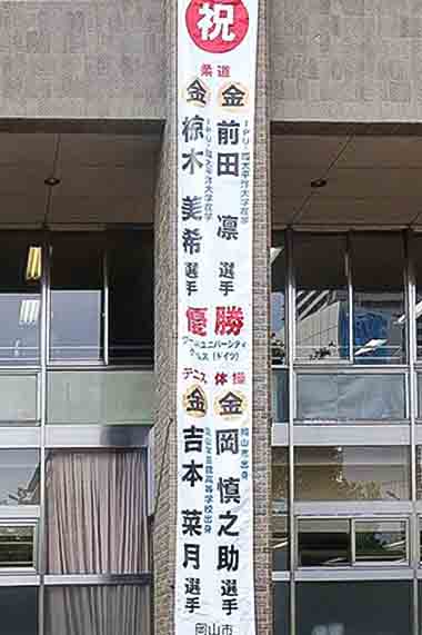 大学生世代の国際総合大会,世界ユニバーシティー夏季大会(7月16日~27日・ドイツ)で体操の岡慎之助選手,岡山市出身で市ゆかりの4選手の優勝をたたえる懸垂幕が8月4日に市役所本庁舎に掲げられました。たたえられたのは男子団体総合優勝の岡選手,学芸館高卒の吉本菜月選手(テニス・混合ダブルス)と,いずれも環太平洋大の前田凜選手(柔道・女子70キロ級、混合団体),椋木美希選手(同・混合団体)です。金メダル獲得にちなんだ「金」の文字を書いてあります。