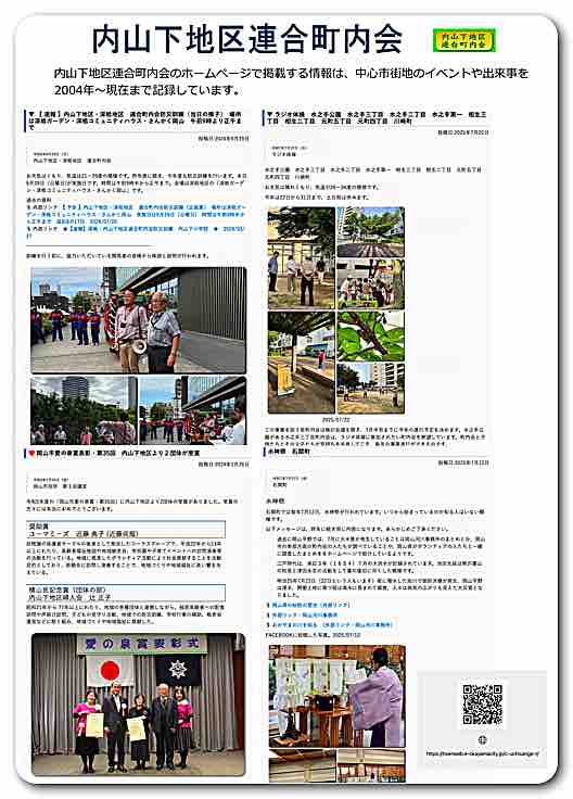 当ホームページは,一般公開向けホームページだけ,2004年から地域内の行事や商店街の様子や公園でのイベントなどを記録しています。単位町内会の事業,活動,そのほかの組織の記録は掲載されません。そのため,前回は,出展展示を辞退しました。今回は,A3用紙版の画像データ(PNG)をOneDriveクラウドへ送り岡山市の担当課へネットダウンロード提出するということにして依頼することにしました。