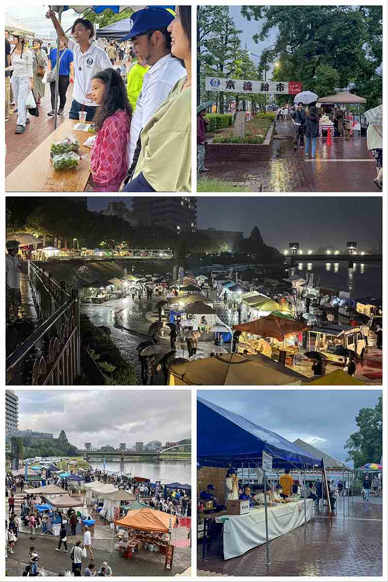 お天気は雨天のち曇りです。気温は23〜29度程度です。旭川の河川敷と堤防上緑地では,夜明け前から午前10時ごろまで「京橋朝市」が催行されています。この催事は近隣の町内会長さんたちと有志の人たちで運営しているボランティア活動で,毎月第一日曜日に開かれていますが,10月は第一日曜日に行われ今回が470回となります。
