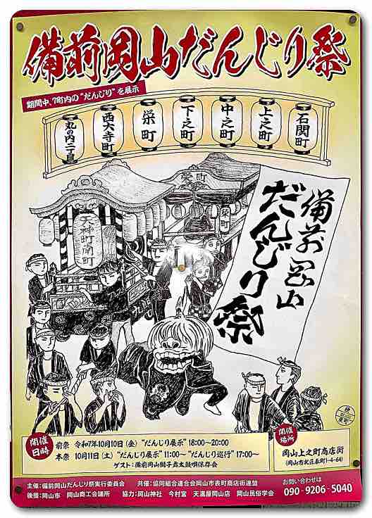 11日は午前11時からだんじりを展示,同所で「備前岡山獅子舞太鼓唄保存会・備前岡山獅子舞大太鼓唄・無形民俗文化財」による獅子舞演舞の披露。午後5時ごろからだんじり巡行を行います。下之町がだんじり(2021年の夏に復活)を出します(子供が少ないから大人たちにより式典の後に迅速に町内へ戻ります)。