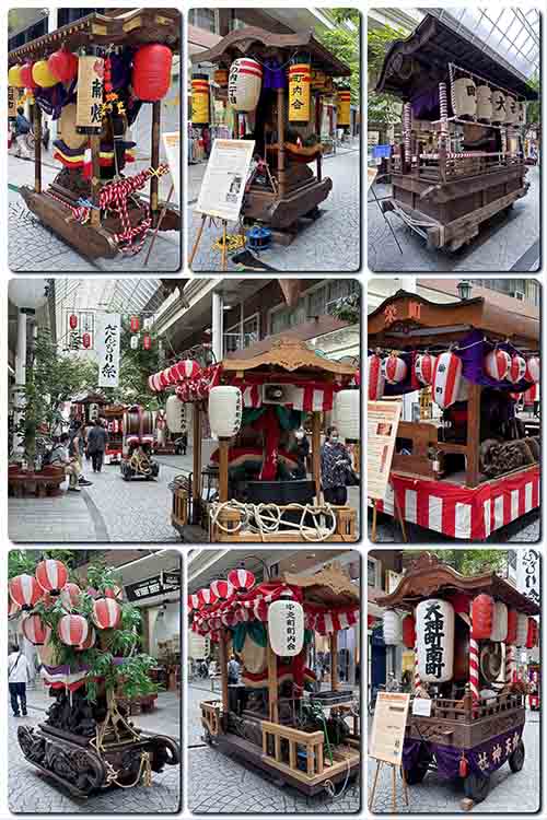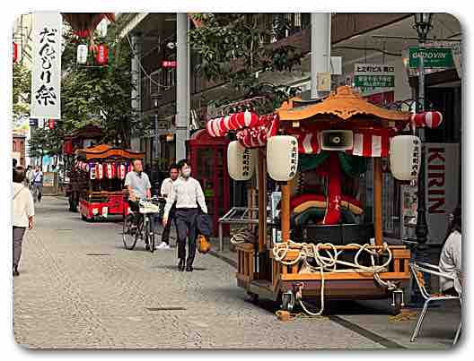 表町のだんじりが五つ,離れている町内は二つあり,毎年夜になってからだんじりを動かします。今回の催事では,明るい夕方前に通りがかりの人で混み合う表町を通ります。