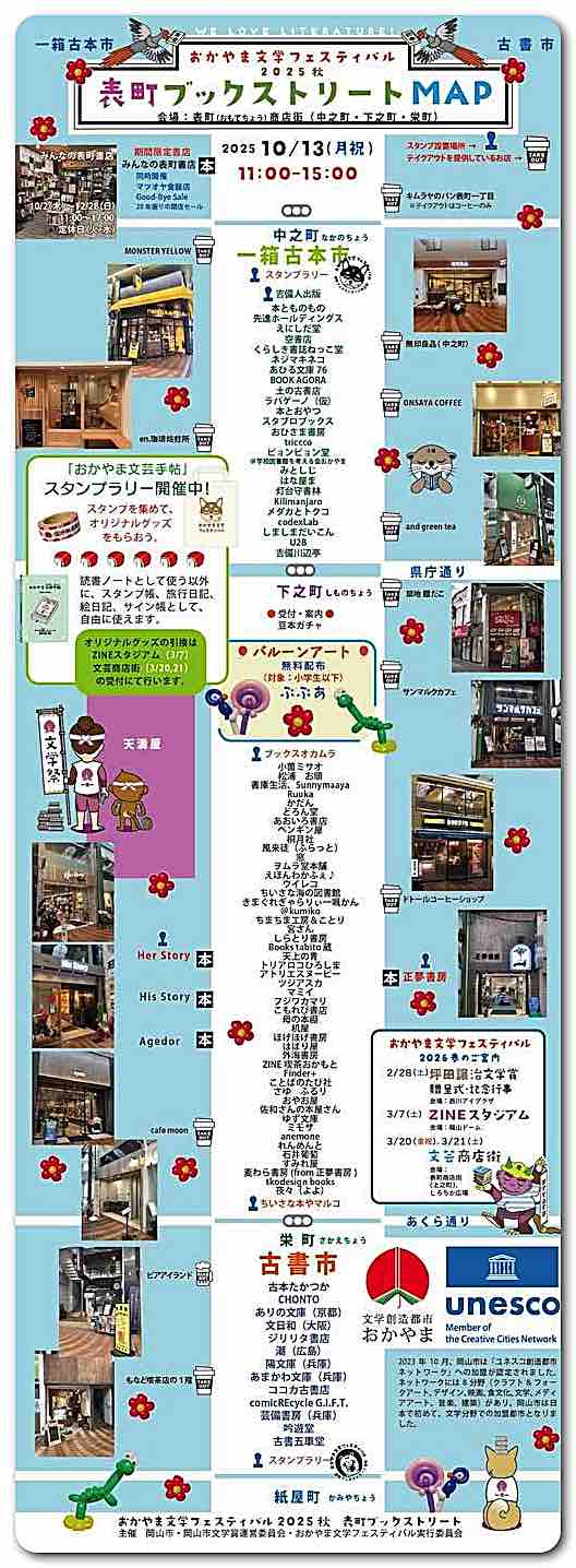ポスターには2025年から2026年に行われる事業が紹介されているようです。内山下小学校は閉鎖されてイベント禁止なのでZINEスタジアム事業は岡山ドーム(西長瀬)で2026年3月7日に行われるようです。文芸商店街も内山下小学区が使用不可能なので,城下地下広場・岡山市表町商店街(上之町)・シンフォニービル周辺にて2026年3月20日から21日に行われるようです。