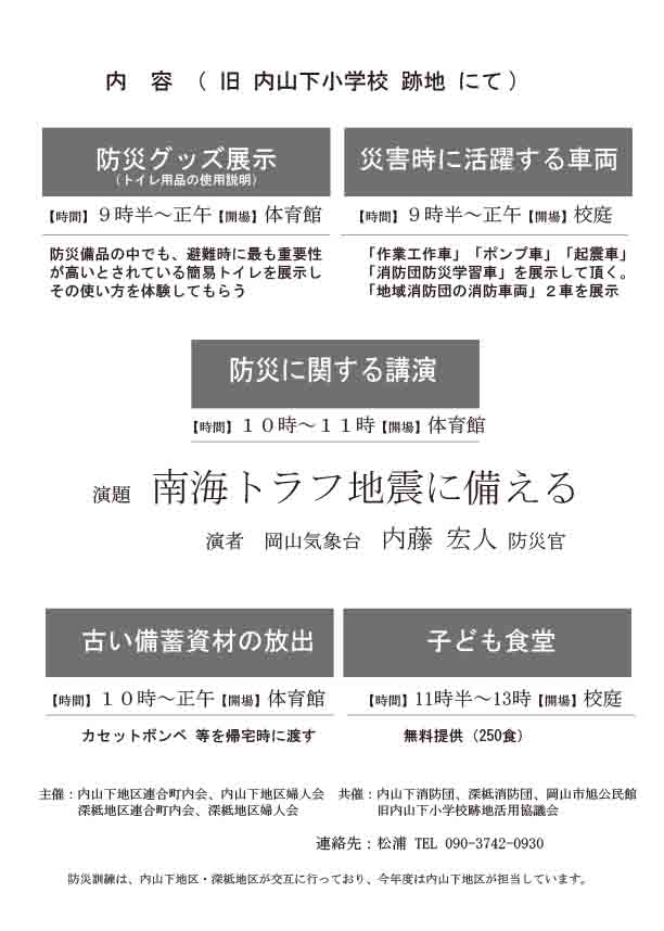 § 内部リンク 【 予告 】内山下地区・深柢地区 連合町内会防災訓練(企画案) 場所は深柢ガーデン・深柢コミュニティハウス・さんかく岡山 実施日は9月29日(日曜日) 時間は午前9時半から正午まで 追記8月17日 2024/07/20