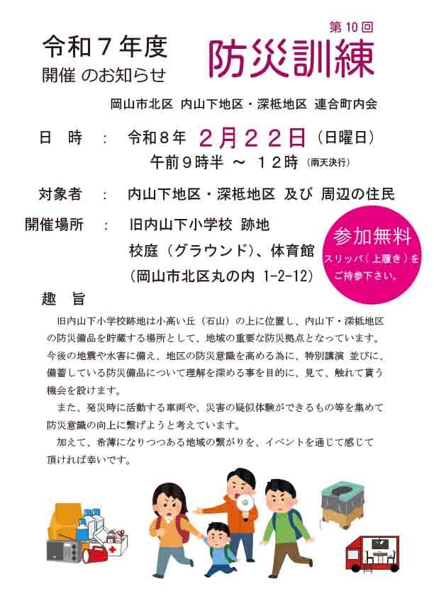 歳末ご多忙の折ではございますが、皆様お元気でお過ごしのことと存じます。16日に松浦会長(内山下地区連合町内会)から「第10回防災訓練」につきまして公式PDF資料が仕上がった件で通知されました。主題は2026年(来年)の令和8年2月22日(日)午前9時半〜正午に行う,「令和7年度 第10回 内山下・深柢地区防災訓練」となります。