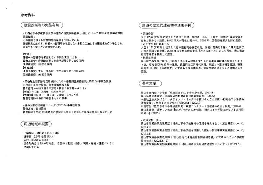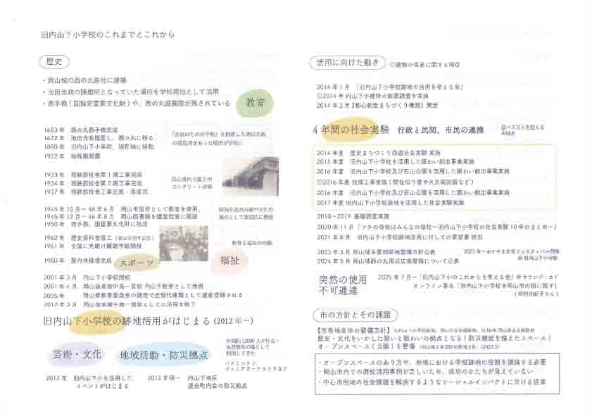 内山下地区連合町内会は,19日に松浦会長(内山下地区連合町内会)から「旧内山下小学校を岡山市の街に残す(署名活動)」「旧内山下小学校見学会資料」「朝日新間2025年10月3日朝刊21ぺージ岡山全県」の三件につきまして公式PDF資料を,ウェブ管理人へ通知しています。
