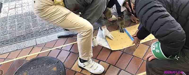 2026/01/14 中之町の鋪道中央に設置した様子 古い点字ブロックを除去し新品と交換する