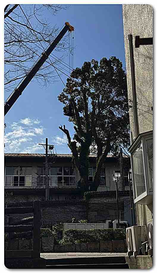 20日,大木の大規模な剪定作業が行われます。 内山下小学校体育館の北側に半世紀を超えて成長した大木があります。この大木の根は石垣に近く,地上からの高さが20メートル程度と思われるのですが,その大木の剪定作業が,クレーン車と産廃運搬トラックと作業員たちにより実施されています。