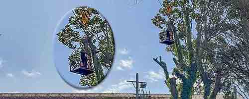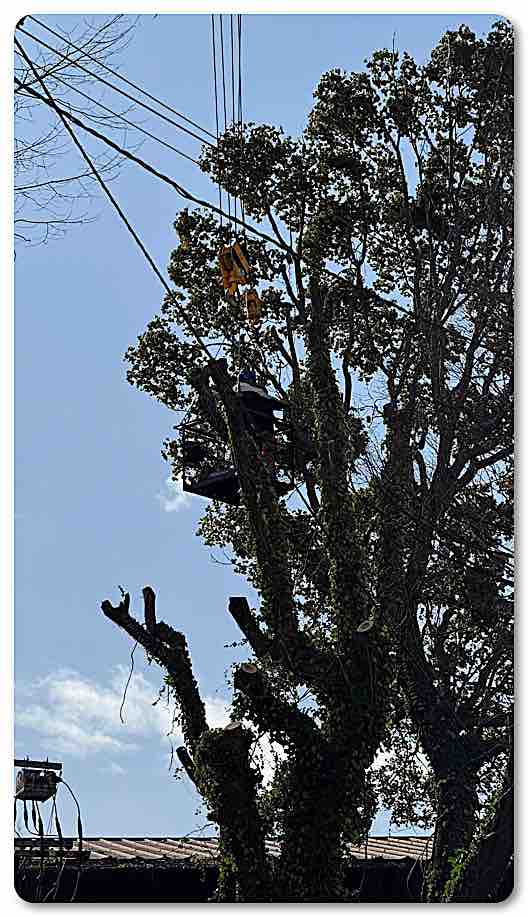 剪定作業員は玉かけした鉄カゴに入り大木を切除するあたりまで釣り上げた状態で,前作業として作業員が手作業で木が落下しない措置をします。次に剪定した木が空中で暴れないように制御できる綱を設置します。そのあと,確認作業,次に切除となるようです。