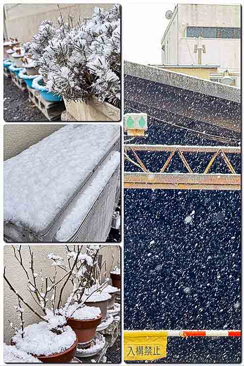 お天気はくもり晴れ,気温が-2〜8度の模様です。正午ごろから1時間程度,雪が舞う様子が見えました。天気予報では日中が湿雪となっています。街路樹や歩道,公園などに僅かですが積りました。湿った雪なので歩道や道路はすぐに溶けています。