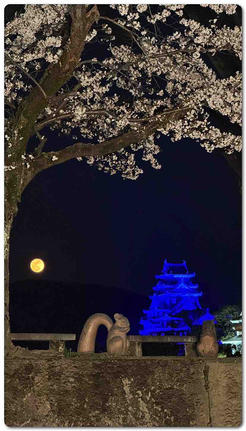 青い烏城 月明かり そして満開の桜 石関町