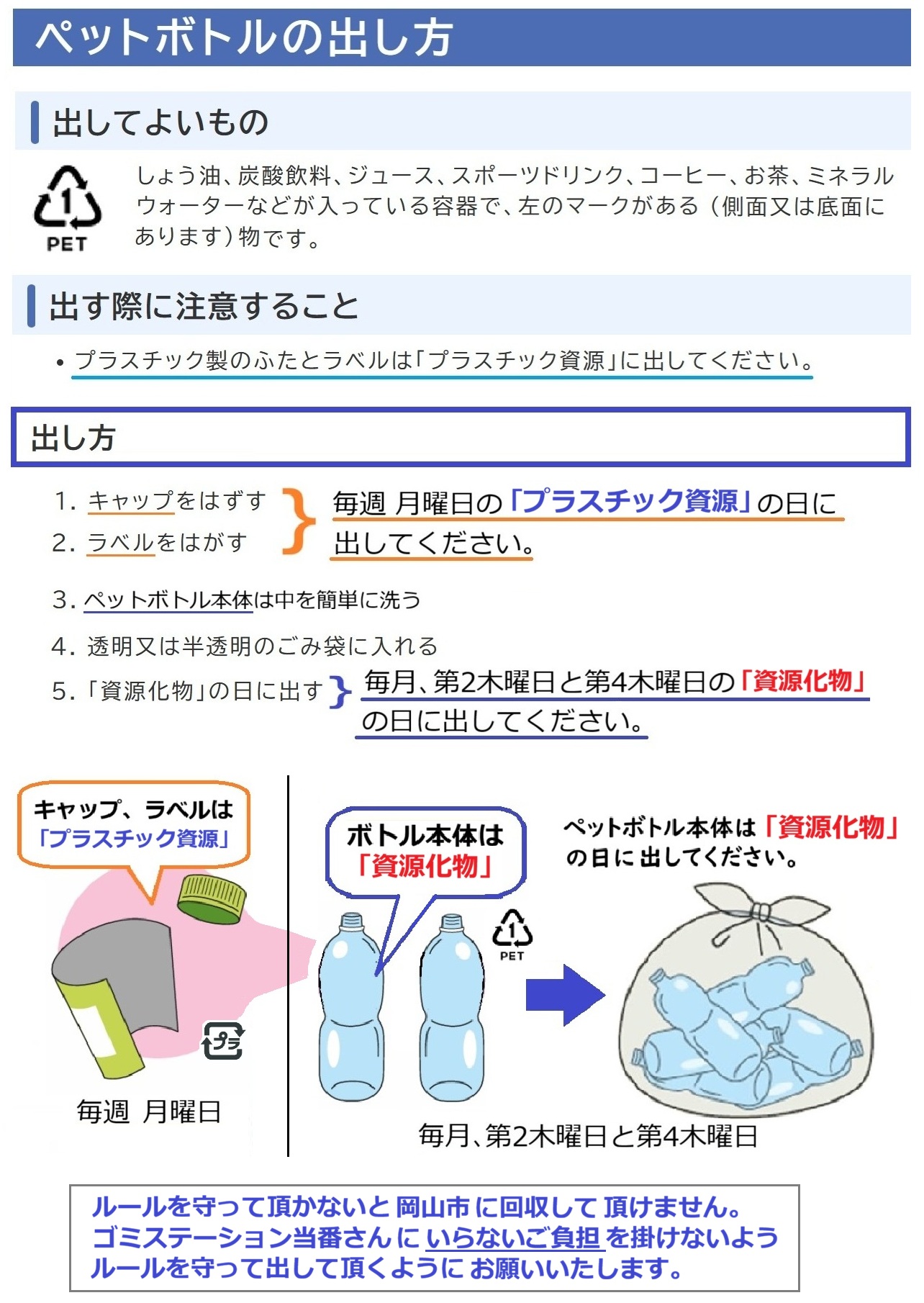 下のURLをクリックしていただくと 岡山市の「ペットボトルの出し方」の