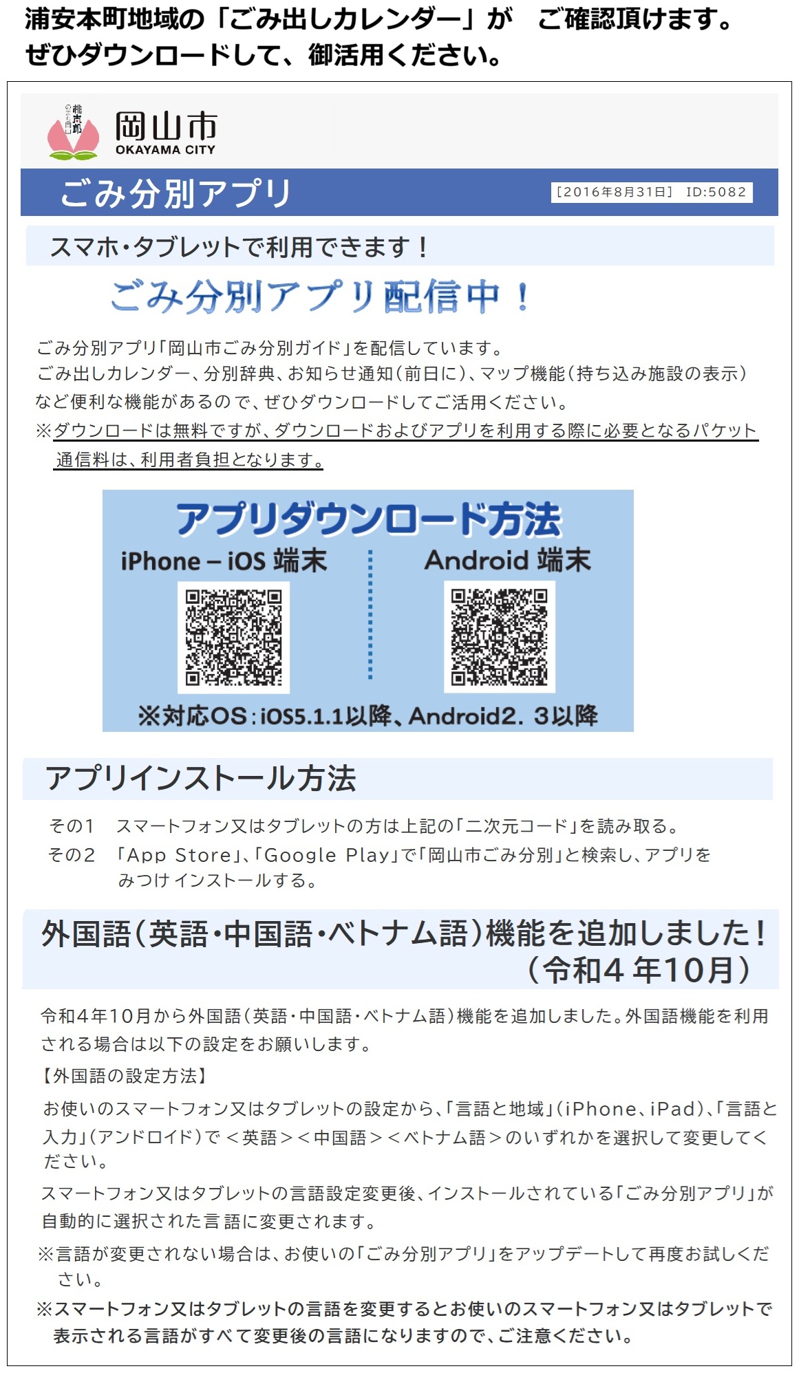 岡山市の「ごみ分別アプリ」ご活用のお願い