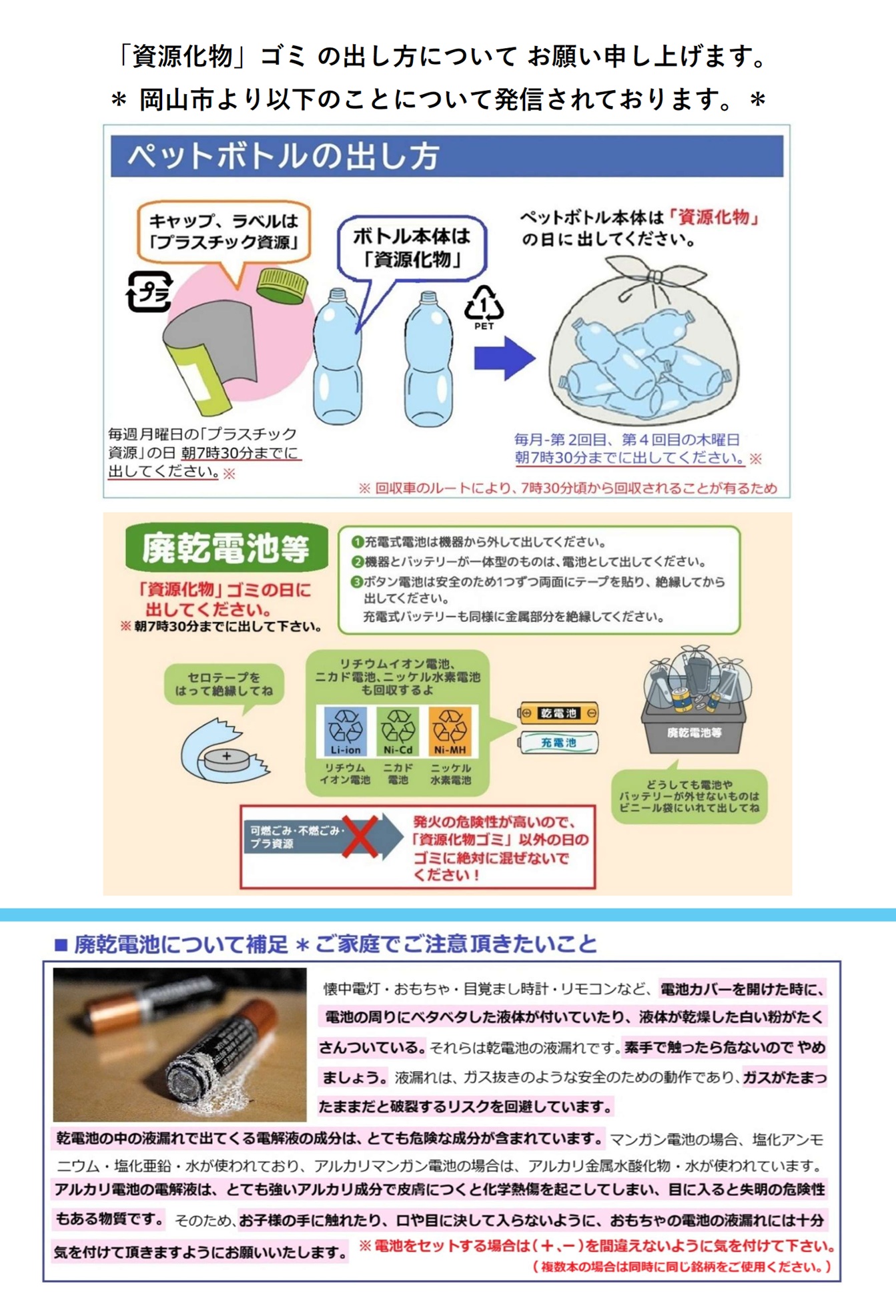 「資源化物」ゴミの出し方についてのお願いを申し上げます。 投稿日:2025年12月1日 「ペットボトルの出し方」「廃乾電池の出し方」についてのお願い・・ 「廃乾電池について ご注意いただきたいこと」のご案内・・ カテゴリー:未分類