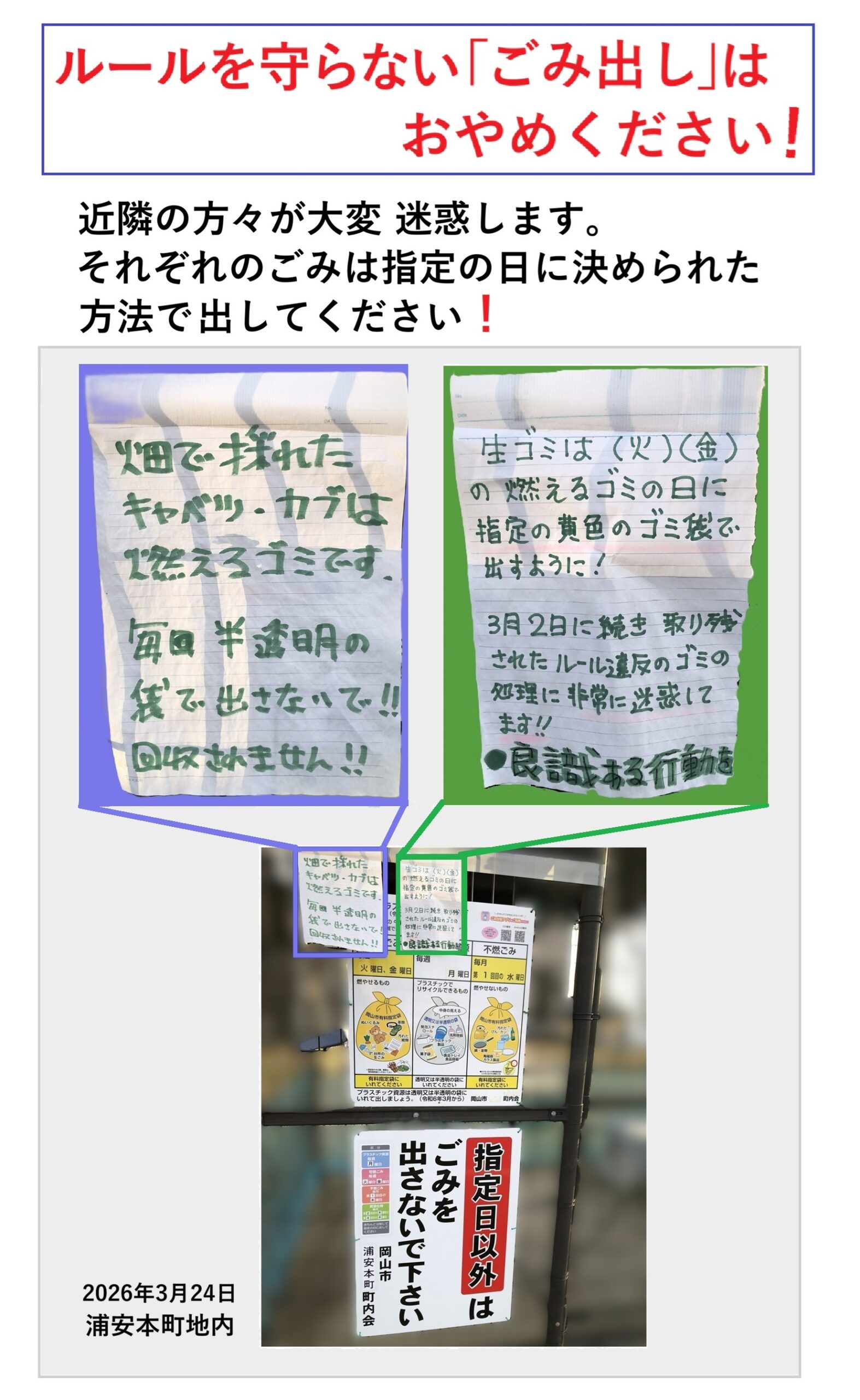ごみ出しルールを守ってください! 保健衛生部 投稿日:2026年3月24日 最近、「岡山市のごみの出し方ルール」を守っていただけない例が増えています。 ルールを守って頂かないと、近隣の方々やゴミST当番の方に大変な負担を強いる こととなります。他の方に要らぬ迷惑をかけないように良識ある行動をお願いい たします。 カテゴリー:未分類