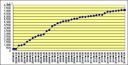 電子町内会に参加されている町内会全体の会員数の推移グラフです。 全電子町内会(79町内会)の会員数合計は7,170人です(12月1日現在)。 |