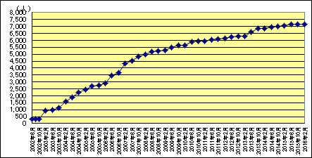 電子町内会に参加されている町内会全体の会員数の推移グラフです。 全電子町内会(79町内会)の会員数合計は7,177人です(3月1日現在)。 |