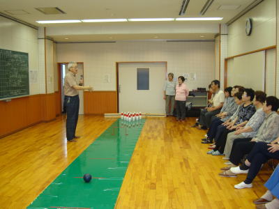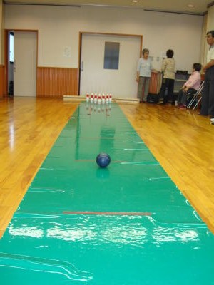 5人1組のチームに分かれて闘います。ポイントは先頭ピンの手前2mに設置したゲートをくぐらせてピンを倒すこと。