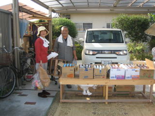 | 一段落して今後の組の清掃、美化について打ち合わせ | 集荷作業で自家用車も大変です。 | 参加賞のジュースを貰いに 今年は少なくてさみしそうな感じ |