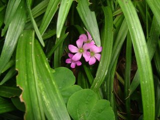 ![]() 紫片喰(ムラサキカタバミ) Lilac oxalis カタバミ科 別名:桔梗片喰(キキョウカタバミ) 花期:6月初 園内:鶴舎、馬場、他随所 |