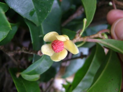 開花した花の中心部が雄花は赤く、雌花は薄翠。