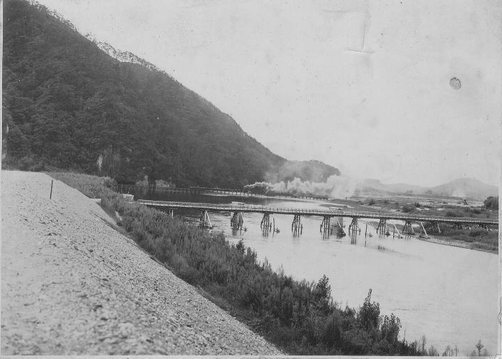 トロッコ列車の線路を引いて、堤防工事用のバラスを積み込んでいるところと思われる。