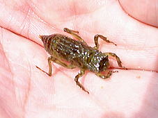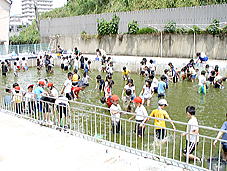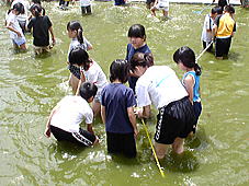 | 小学校のプールのヤゴを救い出す 最初は牧石小学校です。5月19日午前9時に先生と3年生の子が次々とプールへ集まってきた。この日はプールに薬を入れて洗う前に、中のヤゴを救いだす日でした。 6年ほど前に牧石小学校に訪れ、校長先生にプールにいるヤゴを子ども達と救い出しませんか?と言うと校長先生も、「やろう、やろう、良いことじゃあないか」と乗り気になって下さり、プールのヤゴを救い出すことが始まりました。 子ども達が次々とたくさんのヤゴを救い出しました。タイリクアカネとシオカラトンボのヤゴですイトトンボの仲間のヤゴを救いだした子もいました。 救い出したヤゴの名前や、ヤゴの飼い方を教えて、実際にどんなトンボになるか見てもらいます。また、子ども達の質問に答えたりして、私にはとても楽しい日になりました。 |