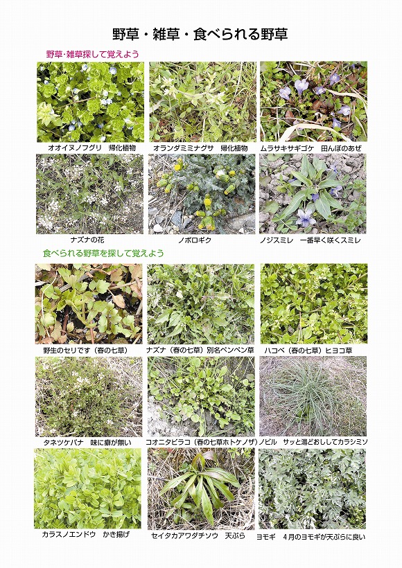 ダチソウ、カラスノエンドウ、タンポポ、オドリコソウ、タネツケバナ、スギナ