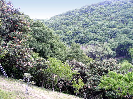 磯尾の西側にある西山の果樹園です。ビワの袋かけが終わると見事です。