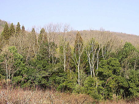船山の桃畑の林と笠井山のすそのです。常緑樹とアベマキの幹とのコントラストがいいでしょう。絵に描きたいような景色です。