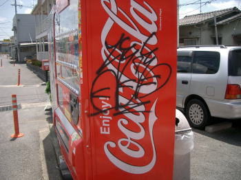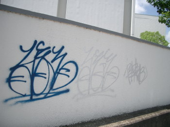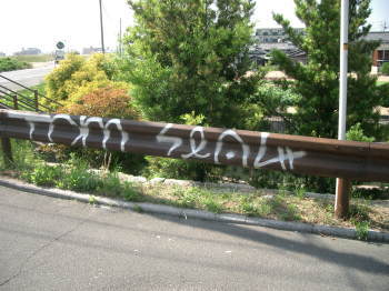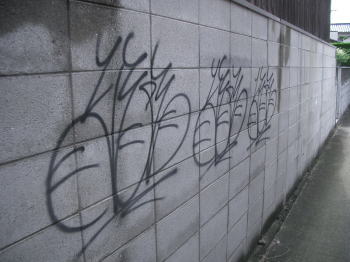 ![]() コンクリート塀に真新しい書き込みが・・・6月13日夜〜14日朝にかけての犯行 |