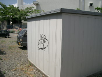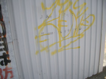 ![]() 平井六丁目、平井元町町内会倉庫に、平成19年6月7日から8日にかけて、黄色のスプレーで意味不明でマークかサインのような落書きが、・・不審な予感 |