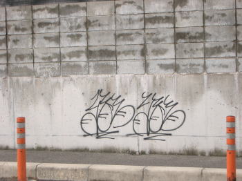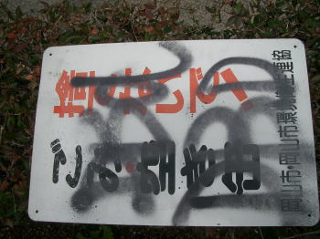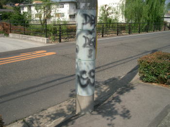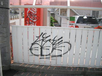 ![]() 6月19日夜から20日朝にかけて、今度は銀色スプレーで右側に二つの落書きをされました。 |