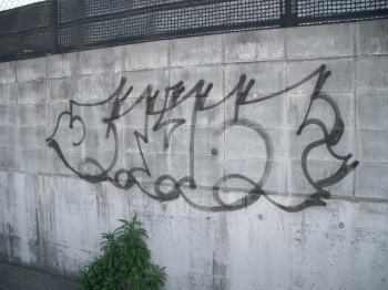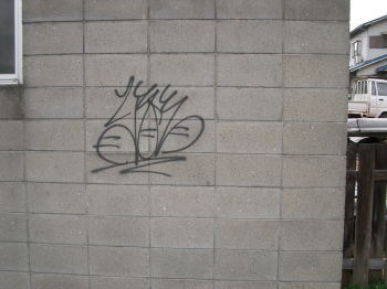 ![]() 民家のブロック塀に書かれた落書き、右の落書きと同時に書かれたもの。 |