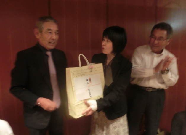 | 前平井小学校教頭 森安啓子先生 ご挨拶 | 会長から前教頭森安先生へ記念品贈呈 | ||