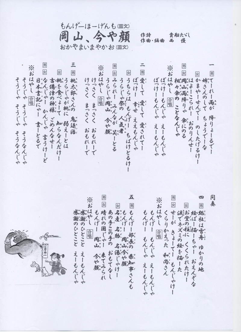新曲名 「もんげー方言も 岡山、今や顔」 楽譜付き歌詩はこちら |