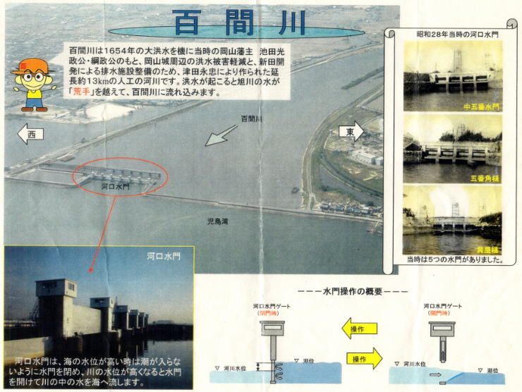 百間川は旭川流域の、洪水が起こると旭川の水が「荒手」を越えて、百間川に流れ込みます。
