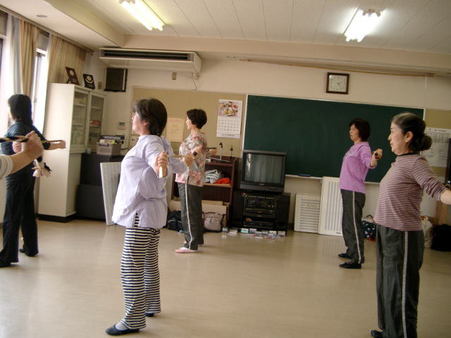 山本枝美子先生のご指導で、毎週1回 昼の部・夜の部と行っています。 □ 背筋のストレッチ、体側の筋肉を引き伸ばす。 □ 二の腕のぜい肉を取る。 □ ポッコリおなか。 □ 首、あごのたるみ。 □ ヒップアップ。 等を目標に、運動不足を解消しています。 終わった後は 気分スッキリ!! 時には、おしゃべりを入れて みんな楽しく健康維持のために がんばって続けています。