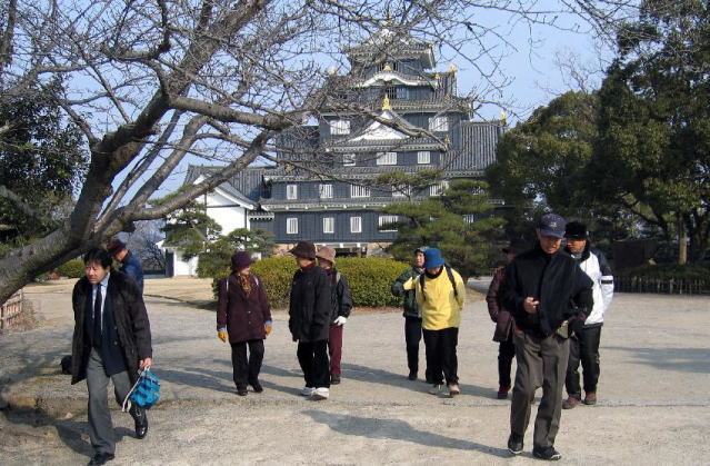 岡山市内の 戦争遺跡めぐりと、岡山後楽園の お田植えまつり の見学をしました ( 10名参加 )。