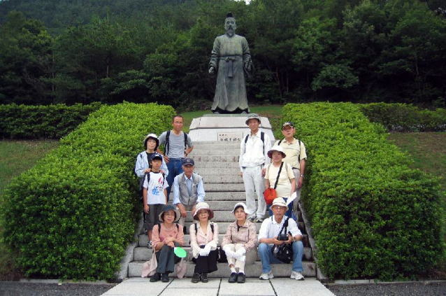 吉備真備像の前で、記念撮影