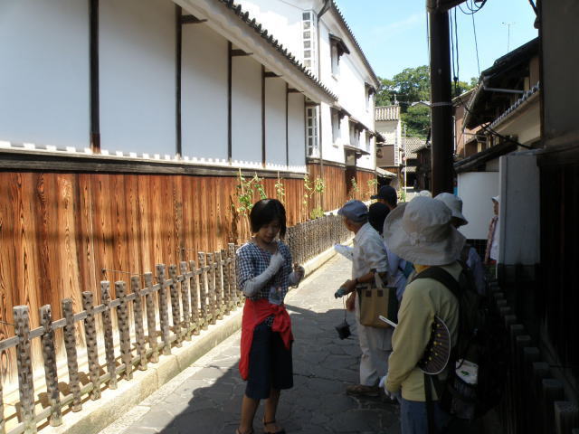 古い町並みを、ボランティアガイドさん(赤の腰巻き?)の