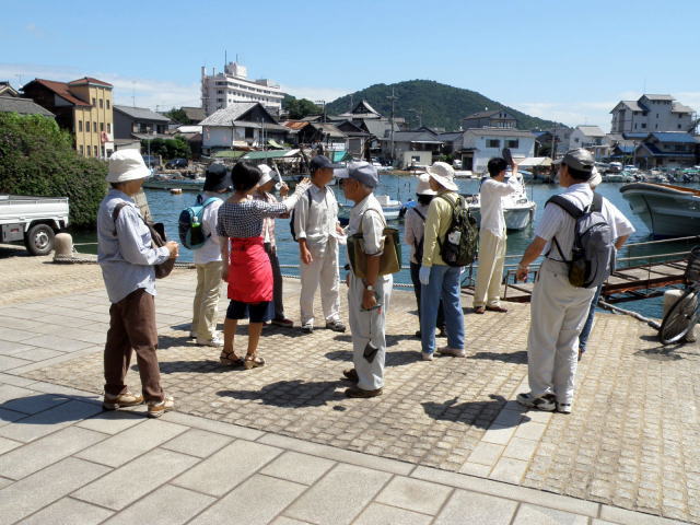 常夜灯付近の海辺で、ガイドさんのお話です。
