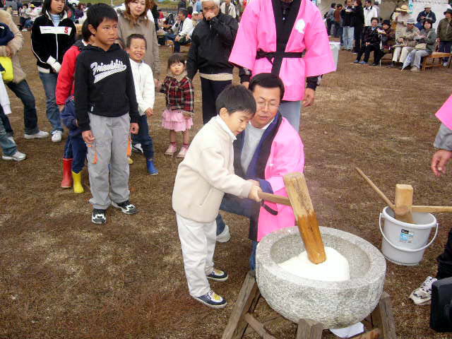 係のおじさんの手助けで、ちびっ子もちつき!!