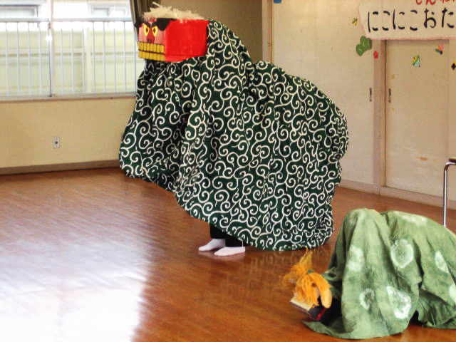 こままわし や けん玉などの昔遊びと、職員手づくりの獅子舞などで 笑顔いっぱい全員楽しみました。