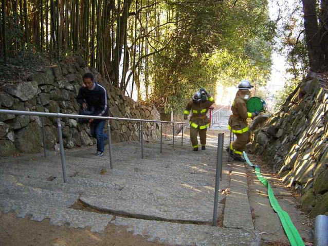 急な階段を ホースを担いでの登りです。