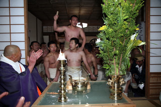 宝木をいったん寺に奉納する福男たち。
