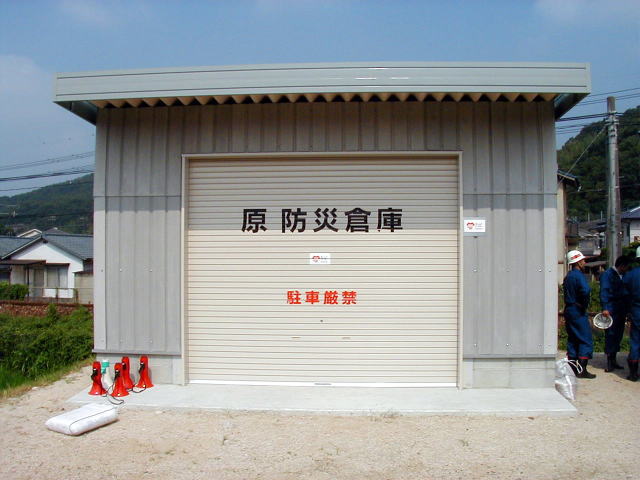 原町内会の防災倉庫 完成記念行事として、開所式及び放水訓練や起振車による体験、土のう作成、