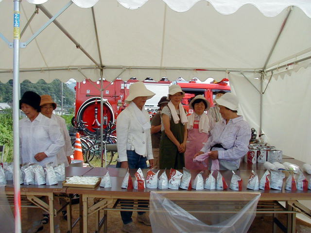 | 避難食(アルファ米)の 炊き出し班は、原町内会の 美人連の面々です。 |