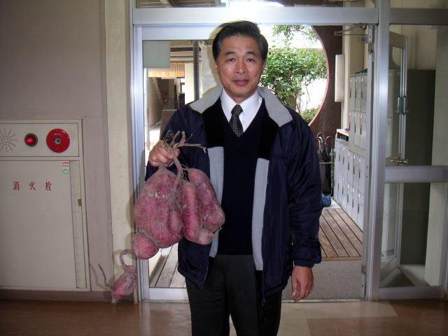 河本町内にお住いの 菊池 衛さんが 大きな大きなサツマイモを作られ、牧石小学校に 寄贈されました。