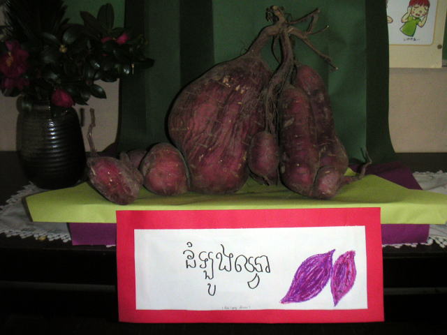 芋の下の説明板は、現在 牧石小学校で 受け入れ中の海外技術研修員で カンボジアのプラック ブンリットさんが 書いたもの。