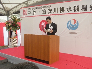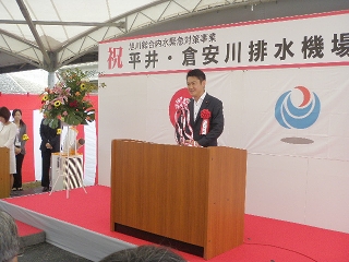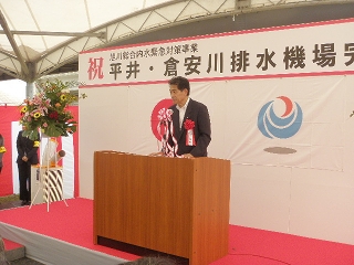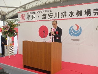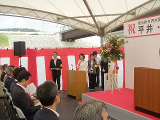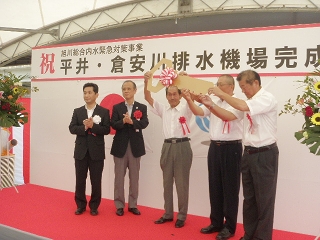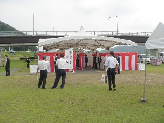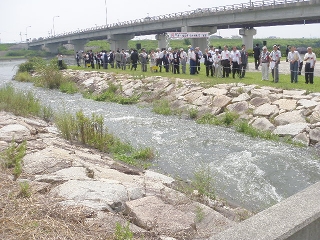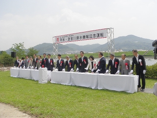 朝から猛暑の中、60数名の出席者のもと百間川右岸高水敷に設置されたテント内で式典が開催されました。湊町内会から町内会長と土木水利委員3名の計4名が出席しました。以下は完成式模様をご覧下さい。 |